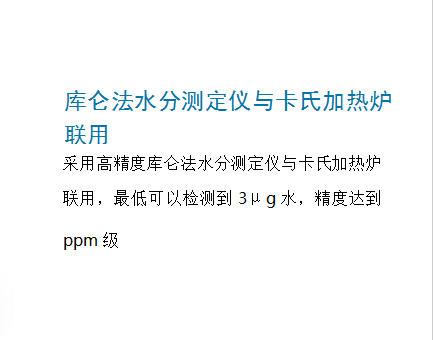 - 采用高精度庫(kù)侖法水分測(cè)定儀與卡氏加熱爐聯(lián)用,最低可以檢測(cè)到3μg水,精度達(dá)到ppm級(jí)