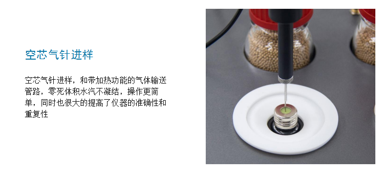 - 空芯氣針進(jìn)樣,和帶加熱功能的氣體輸送管路,零死體積水汽不凝結(jié),操作更簡(jiǎn)單,同時(shí)也很大的提高了儀器的準(zhǔn)確性和重復(fù)性;